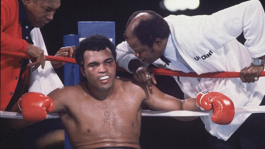 Ο Άλι- ένα κακέκτυπο του πρότερου, ανίκητου εαυτού του- δίνει την εντύπωση πως δέχεται μοιρολατρικά, σχεδόν, τα χτυπήματα, περιμένοντας απλά τη λύτρωση. Συνεχίζει, ίσως μονάχα επειδή υπήρξε ο Μέγιστος, να στέκεται όρθιος. Στον 9ο γύρο, όμως, ο αντίπαλός του με ένα hook του τσακίζει τα πλευρά. «Ούρλιαξε», λέει ένα μέλος από το τιμ του Μοχάμεντ. «Και δεν τον θυμάμαι ποτέ να ουρλιάζει».
