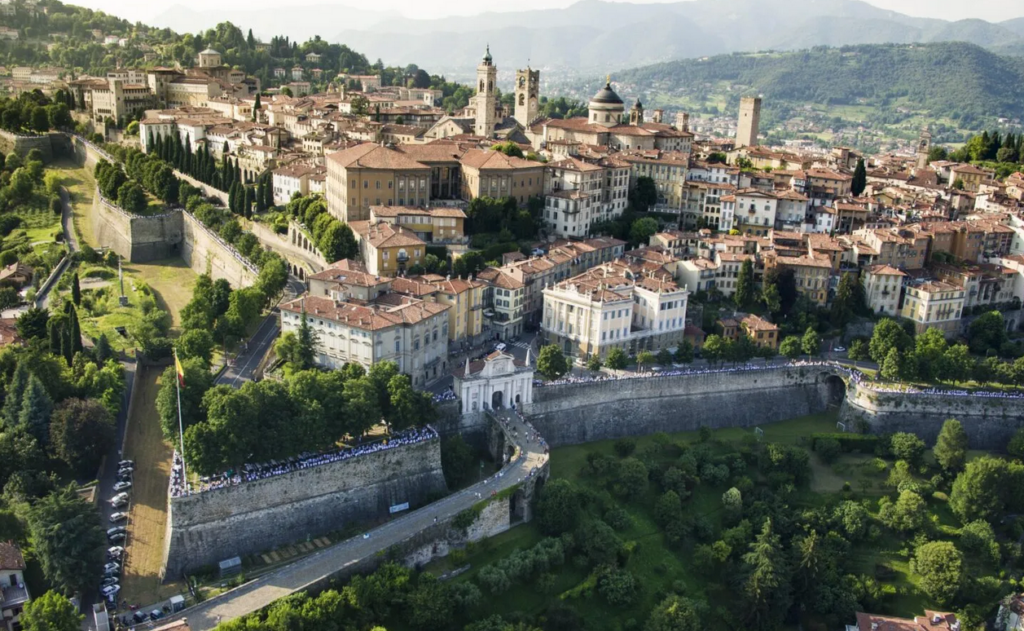Υπάρχει μια γραφικότητα, μια αίσθηση ρομάντζου στον αέρα. Σε κάνει να θες να περπατήσεις, να αφήσεις το χρόνο να περάσει για να παρατηρήσεις πρόσωπα και πράγματα, για να βιώσεις την εμπειρία, να μην αφήσεις απλά να «τρέξει». Αν σε φέρει η τύχη ποτέ εκεί, το πρώτο πράγμα που καλό είναι να κάνεις ως επισκέπτης είναι να πας στη μεσαιωνική πόλη Citta Alta, που είναι ψηλά πάνω στο λόφο και οριοθετείται από καλοδιατηρημένα ενετικά τείχη. Έρχεται σε ευθεία, αλλά με κάποιο τρόπο αρμονική, αντίθεση με το σύγχρονο κομμάτι της πόλης, την Citta Bassa με τις πλατείες και τα μαγαζιά.