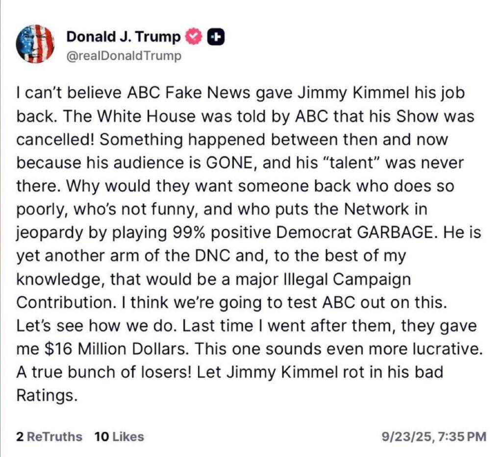 Απλά κοιτάξτε τι έγραψε ο Τραμπ στο Truth Social αμέσως μετά την επιστροφή της εκπομπής για να καταλάβετε πόσο προσωπικό και επικίνδυνο έχει γίνει, πόσο δεσποτικό και παρεμβατικό: «Δεν μπορώ να πιστέψω ότι το ABC Fake News έδωσε πίσω τη δουλειά του στον Τζίμι Κίμελ. Το ABC είχε ενημερώσει τον Λευκό Οίκο ότι η εκπομπή του ακυρώθηκε! Κάτι συνέβη από τότε μέχρι τώρα, γιατί το κοινό του ΕΧΕΙ ΕΞΑΦΑΝΙΣΤΕΙ και το “ταλέντο” του δεν υπήρχε ποτέ.