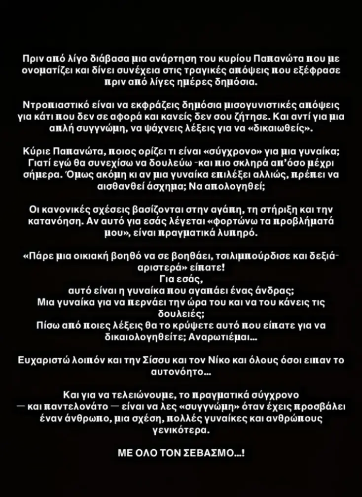Η Ελένη Βουλγαράκη του απάντησε, και ήταν μια χαρά απάντηση. To the point, ξεκάθαρη. «Ντροπιαστικό είναι να εκφράζεις δημόσια μισογυνίστικες απόψεις για κάτι που δεν σε αφορά και κανείς δεν σου έχει ζητήσει. Και αντί για μια απλή συγνώμη, να ψάχνεις λέξεις για να “δικαιωθείς”», έγραψε, μεταξύ άλλων.