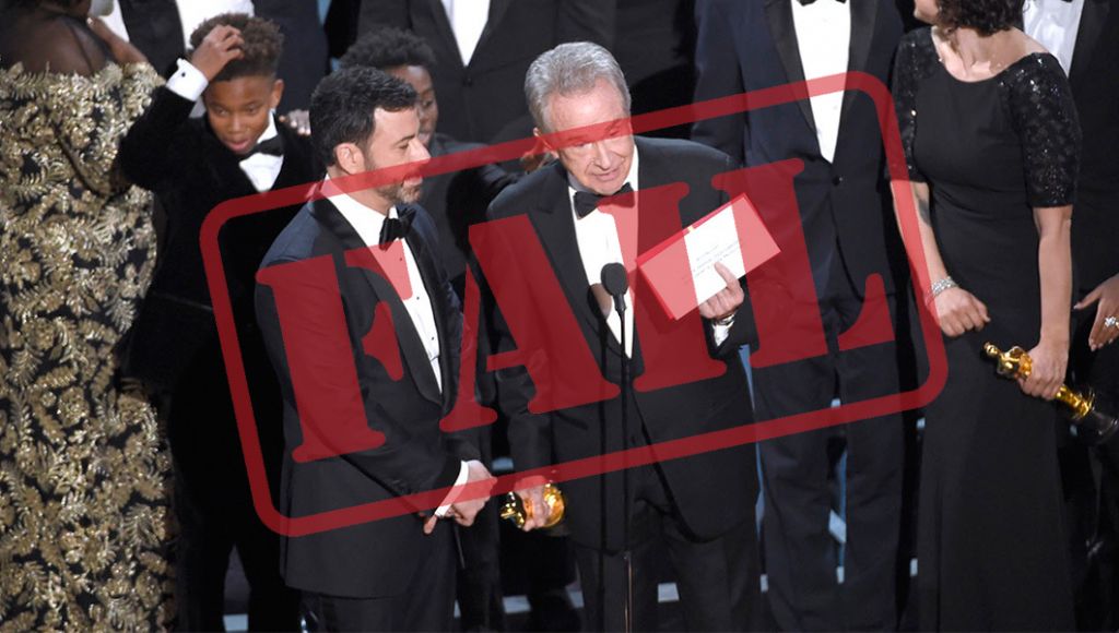 Όταν ο Γουόρεν Μπίτι και η Φέιν Ντάναγουεϊ άνοιγαν τον φάκελο και διάβαζαν τον νικητή του βραβείου της Ακαδημίας για την καλύτερη ταινία της χρονιάς δεν περίμεναν ποτέ ότι οι υπεύθυνοι που τους τον παρέδωσαν είχαν κάνει λάθος. Ο Γουόρεν Μπίτι άνοιξε τον φάκελο, διάβασε ότι ήταν λάθος κατηγορία και τον έδωσε στην Φέι Ντάναγουεϊ. Αυτή δεν πρόσεξε και ανήγγειλε τον λάθος νικητή, την ταινία La La Land.