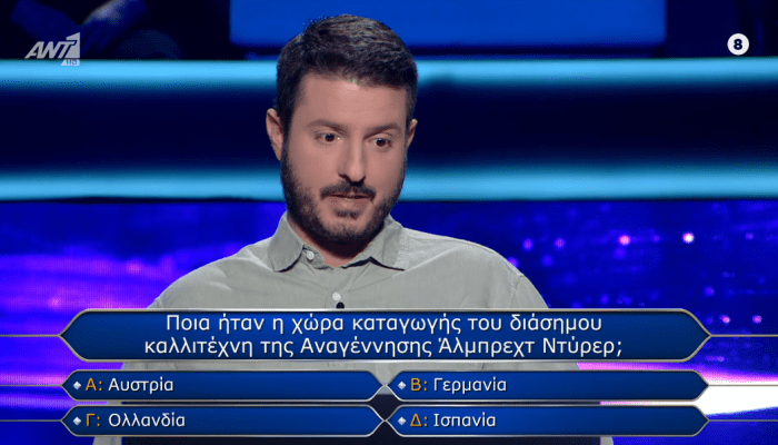 Έφτασε στην 8η ερώτηση για τα 3.000 ευρώ. Είχε τρεις βοήθειες (50-50, κοινό, τηλέφωνο) στη διάθεσή του. Είχε… υποψιαστεί ποια μπορεί να είναι η σωστή απάντηση, αλλά θέλησε μια μικρή επιβεβαίωση αντί να ρισκάρει. Ο… φίλος μας ο Μάκης, συμμετέχων στον «Εκατομμυριούχο» έδειχνε να τα κάνει όλα σωστά…