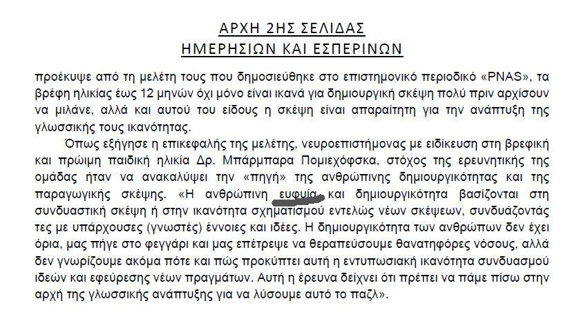«Και ορθογραφικό λάθος είχε το φετινό θέμα της Γλώσσας στις Πανελλαδικές! Στο 2ο κείμενο, 2η παράγραφος: της ευφυίας, γράφει. Ναι, αλλά θέλει διαλυτικά: ευφυΐα, αλλιώς θα προφερόταν “εφία”».