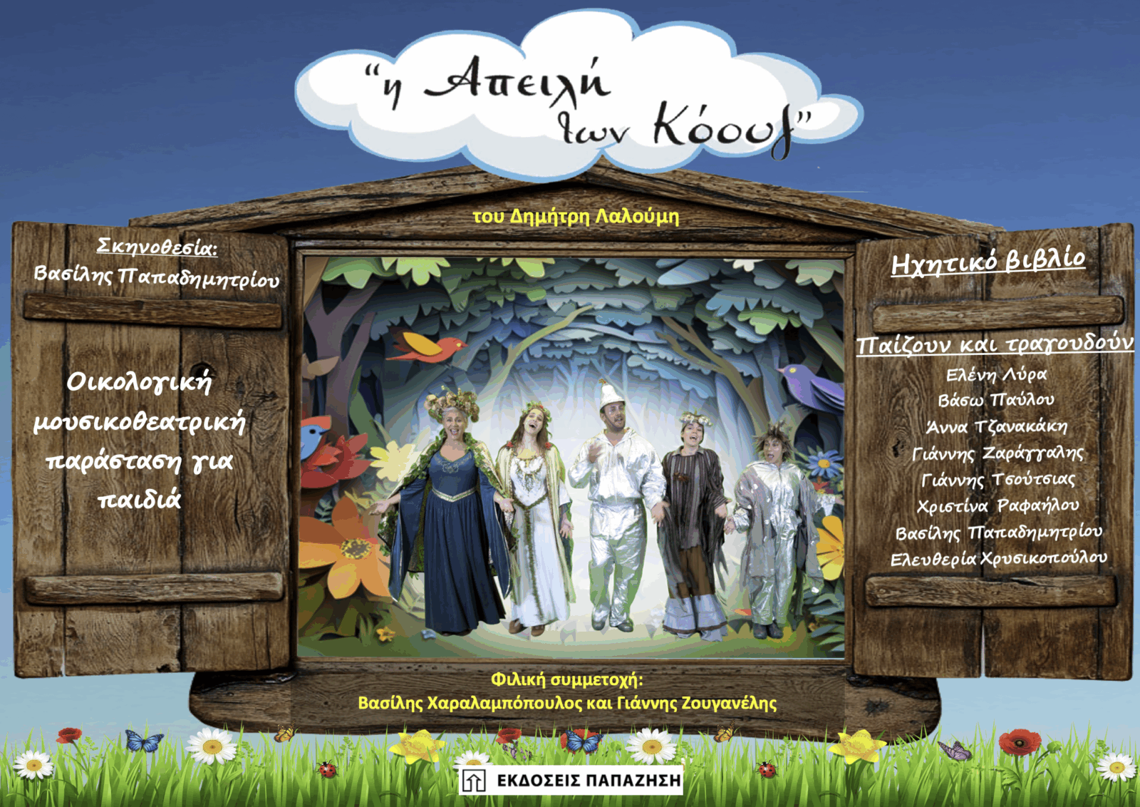 Από τον εκδοτικό οίκο Παπαζήση κυκλοφορεί το οικολογικό παραμύθι «Η απειλή των Κόουζ» με την υπογραφή του Δημήτρη Λαλούμη., που στόχο έχει να ψυχαγωγήσει και να συμβάλλει στην ευαισθητοποίηση των παιδιών στα πολυποίκιλα προβλήματα του περιβάλλοντος, μέσω του θεάτρου και της μουσικής.