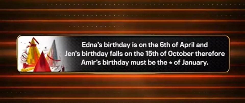 “Edna’s birthday is on the 6th of April and Jen’s birthday falls on the 15th of October, therefore Amir’s birthday must be the ‘X’ of January.”