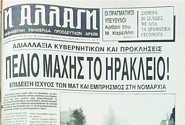 Ήταν Δευτέρα 30 Σεπτεμβρίου, μία από τις πιο ζεστές μέρες εκείνης της χρονιάς, με θερμοκρασίες 40 και 42 βαθμών. Κι ενώ ο υδράργυρος είχε χτυπήσει «κόκκινο», νωρίς το μεσημέρι, στη διάρκεια του συλλαλητηρίου των αγροτών στην πλατεία Ελευθερίας, η κατάσταση ξέφυγε σε βαθμό αδιανόητο. Το κτήριο της Νομαρχίας Ηρακλείου πήρε φωτιά και το σκηνικό χάους και πανικού πλαισίωσαν οι σώμα με σώμα συμπλοκές των διαδηλωτών με τις δυνάμεις των ΜΑΤ.