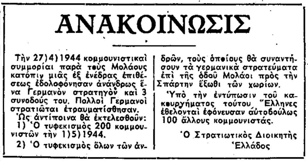 «Την 27ην Απριλίου 1944 κομμουνιστικαί συμμορίαι παρά τους Μολάους κατόπιν μιας εξ ενέδρας επιθέσεως εδολοφόνησαν ανάνδρως έναν Γερμανόν Στρατηγόν και τρεις συνοδούς του. Πολλοί Γερμανοί στρατιώται ετραυματίστησαν. Ως αντίποινα διατάχτηκε: