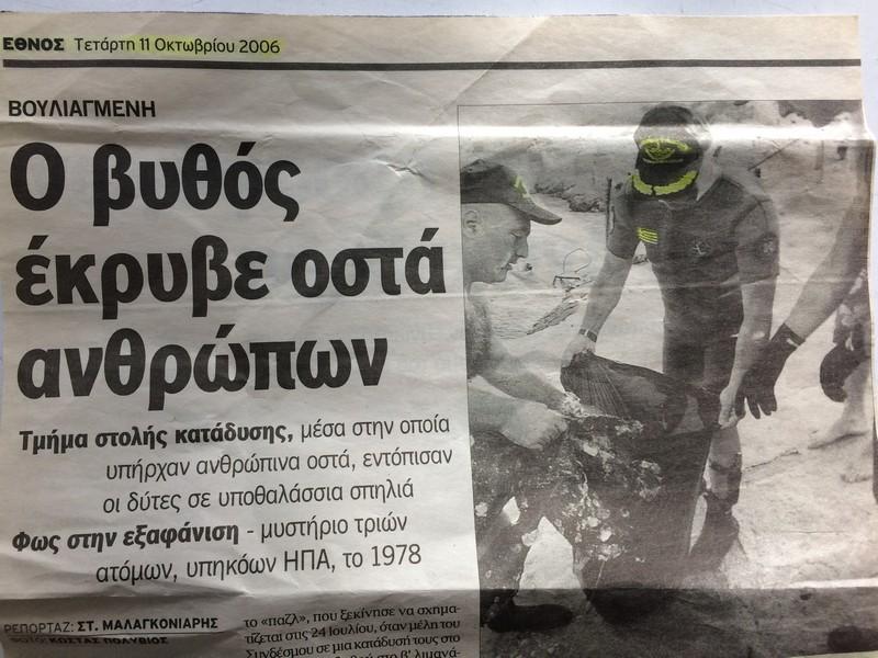 Οι έρευνες για τον εντοπισμό τους υπήρξαν εντατικές σε διάφορες χρονικές στιγμές, αλλά άκαρπες. Μάλιστα σε μια εξ αυτών, το 1990, έχασε τη ζωή του και ένας Έλληνας δύτης, ο Παναγιώτης Τζωρτζάτος. Θα περνούσαν τελικά κοντά 30 χρόνια, χρειάστηκε συγκεκριμένα να φτάσουμε στο 2007, προκειμένου να εντοπιστούν τα οστά τους και να μπει έτσι ένα τέλος σε αυτή την τραγωδία. Οι σκελετοί τους βρέθηκαν μέσα στις φόρμες και τον εξοπλισμό τους, σφηνωμένοι σε σχισμές του τούνελ σε διαφορετικά σημεία, 50 και πλέον μέτρα από την είσοδο. Η φιάλη ήταν καλυμμένη με όστρακα αλλά εντός της υπήρχε ακόμη αέρας. Κάτι που φανερώνει ότι ο κάτοχός της δεν πέθανε πιθανότατα από πνιγμό, αλλά από κάτι άλλο, άγνωστο τι.