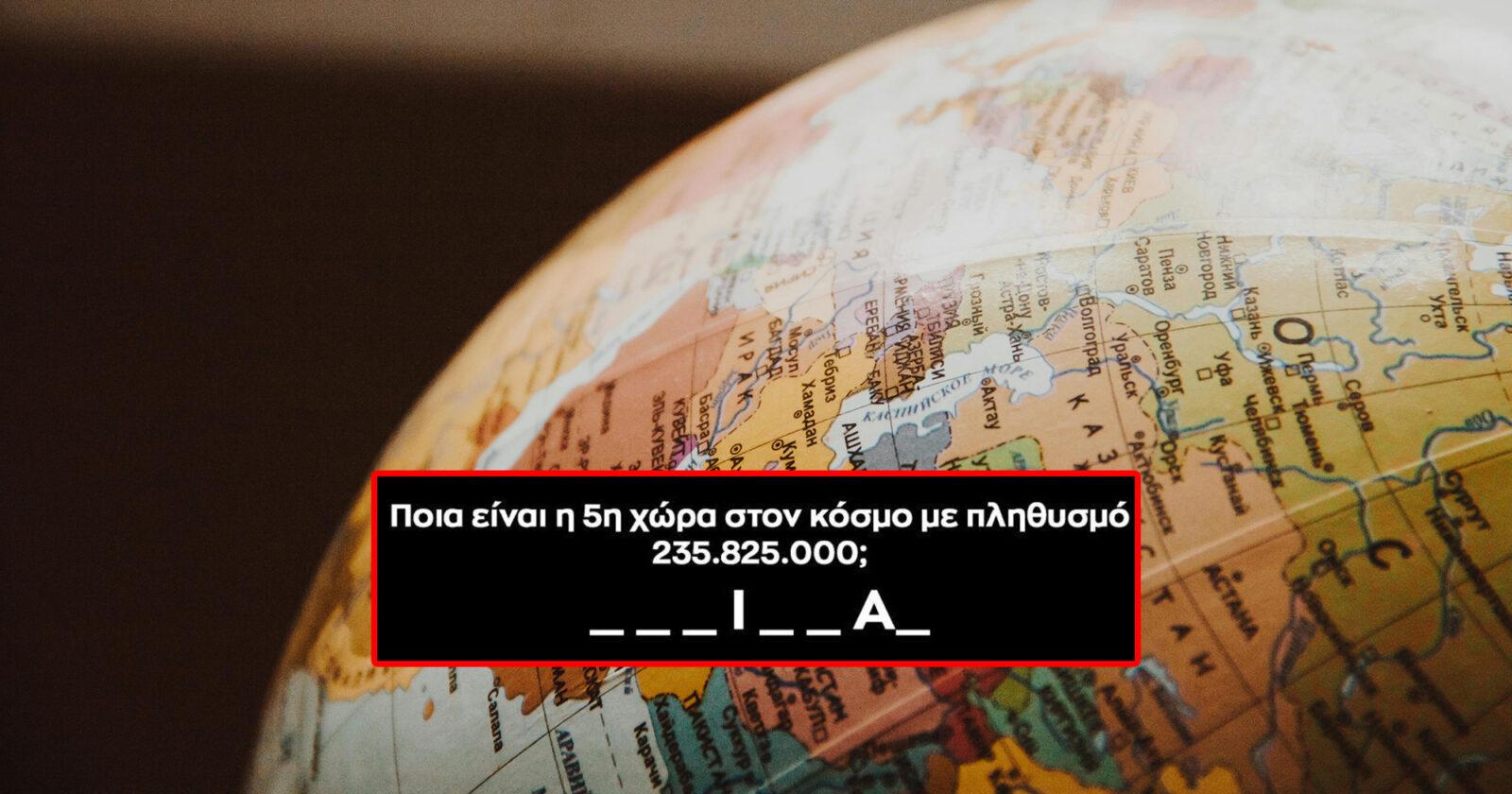 Το ξέραμε και το ξέρατε ότι θα φτάναμε κάποια στιγμή και σε αυτό το σημείο. Στο σημείο που η γνώση γεωγραφικών στοιχείων δεν αρκεί για το κουίζ που σου έχουμε ετοιμάσει. Θα χρειαστεί πολύ καλή μνήμη και μία πρόσφατη ενημέρωση καθώς στο κουίζ γεωγραφίας που θα σε τεστάρουμε ζητείται κάτι που αλλάζει διαρκώς με το πέρασμα του χρόνου. Και αυτό το κάτι είναι ο πληθυσμός.