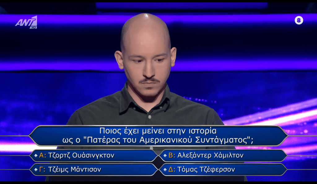 Ας δούμε 5 από τις πιο δύσκολες ερωτήσεις που απάντησε σωστά ο Φίλιππος από τις 10.000€ μέχρι να φτάσει στο μέγιστο έπαθλο των 100.000€ — και έπειτα, δοκίμασε να απαντήσεις κι εσύ. Θυμίζουμε ότι οι αξίες των 5 τελευταίων σωστών απαντήσεων του Φίλιππου ήταν 10.000€, 15.000€, 20.000€, 30.000€ και 100.000€.