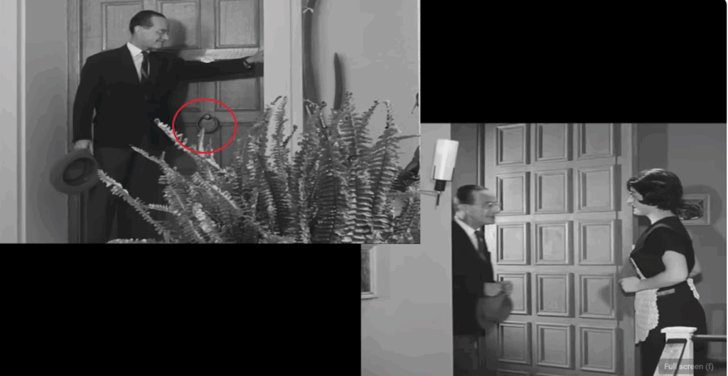 Σε μια σκηνή βλέπουμε τον Θεόδωρο Πάρλα ή Ψευτοθόδωρο, κατά κόσμον Ντίνο Ηλιόπουλο, να επισκέπτεται το σπίτι του βουλευτή Θεόφιλου Φερέκη (Παντελής Ζερβός). Όταν χτυπάει την πόρτα, βλέπουμε ξεκάθαρα πως στην εξωτερική πλευρά αυτής, υπάρχει ένα ευμέγεθες μεταλλικό ρόπτρο. Το οποίο δεν βλέπουμε πουθενά στην αμέσως επόμενη σκηνή. Τι… μαγικό συνέβη; Τίποτα το μεταφυσικό. Απλά στην εξωτερική σκηνή έχουμε να κάνουμε με μια κάμερα που ζουμάρει σε πραγματικό σπίτι, ενώ οι εσωτερικές (σκηνές) έχουν γυριστεί σε στούντιο, σε πλατό.