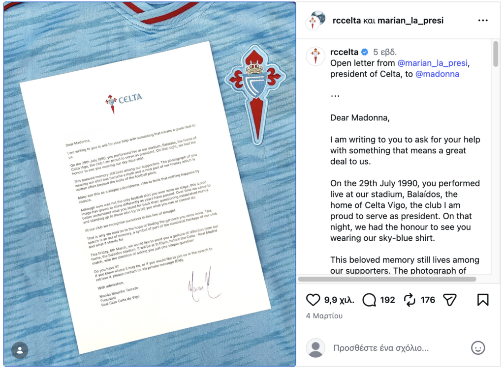 Στις 29 Ιουλίου 1990, εμφανίστηκες ζωντανά στο γήπεδό μας, το Μπαλαΐδος, την έδρα της Θέλτα Βίγκο, του συλλόγου που είμαι περήφανη που υπηρετώ ως πρόεδρος. Εκείνο το βράδυ, είχαμε την τιμή να σε δούμε να φοράς τη γαλάζια φανέλα μας.