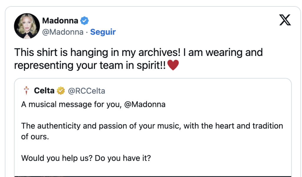 Η Μαντόνα βγήκε στην σκηνή με μία γαλάζια φανέλα της Θέλτα με το νούμερο 5 στην πλάτη και το όνομα του Χοσέ Μανουέλ Εσπινόσα στην πλάτη και προκάλεσε ντελίριο.