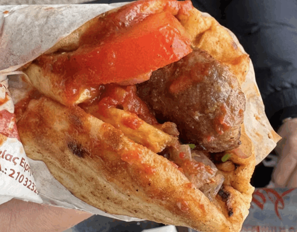 Αναμφισβήτητα πρωταγωνιστής είναι το κρέας, αποκλειστικά σε χοιρινό σουβλάκι, ψημένο ατάκα κι επί τόπου, μπροστά στα γουρλωμένα και ξελιγωμένα ματάκια σου! Πιτούλα, ντομάτα, κρεμμύδι, κόκκινο πιπέρι, γιαούρτι και –για το χρώμα- λίγο μαϊντανό. Μαϊντανό; Ναι, κύριοι, καταπράσινος ολόφρεσκος μαϊντανός, που έρχεται να δροσίσει… καταστάσεις, ειδικά για εκείνους που τυχόν θα καταφύγουν σε πιο καυτερές ιδέες, όπως η αντίστοιχη σάλτσα.