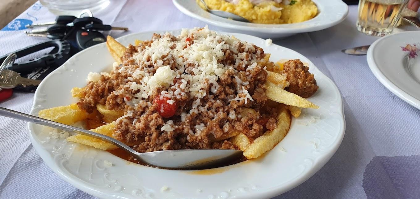 Ένα πεντανόστιμο πιάτο το οποίο συνίσταται από τρία μέρη όλα κι όλα. Πατάτες τηγανιτές, κιμάς και τριμμένο τυρί κατά βούληση να σκεπάσει τα άλλα δύο! Η πατάτα έχει –αυστηρά καταγωγή από Τρίπολη, Αχαΐα ή Νάξο, το τυρί δεν είναι άλλο από ξερή μυζήθρα Καλαβρύτων και ο κιμάς είναι αυτός που περίσσεψε από εκείνον που συνοδεύει τα μακαρόνια. Τόσο απλά, τόσο λαχταριστά και κυρίως τόσο νόστιμα, που αυτός ο συνδυασμός κέρδισε τελικά μια θέση στο τραπέζι και μετατράπηκε στον μεζέ που ζητούν όλοι.