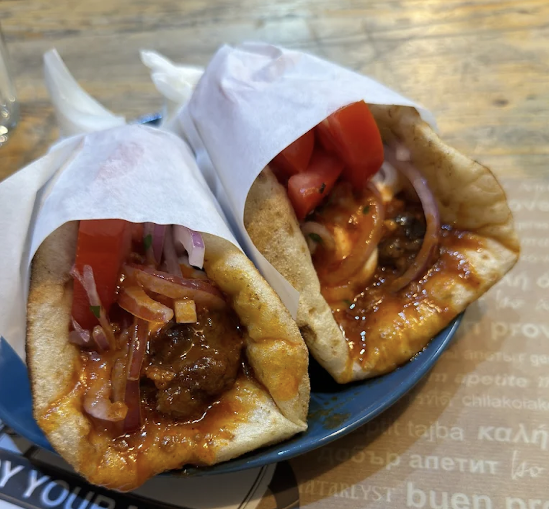 Το γευστικό θαύμα είναι το εξής: Νόστιμο μπιφτεκάκι που θυμίζει κεμπάπ, από μια μίξη μοσχαρίσιου και πρόβειου κρέατος. Ντομάτα, κρεμμύδι, τζατζίκι τυλιγμένα σε αφράτη πιτούλα και στο τέλος μπαίνει το game changer στοιχείο: Μια ελαφριά κόκκινη σάλτσα, με γαλλικές επιρροές. Μυστική συνταγή. Ας είναι. «Δεν θέλω να το μάθω, θέλω να το φάω», που έλεγε και μια παλιά διαφήμιση! Προτείνεται και χωρίς τζατζίκι το άνωθεν (γευστικό θαύμα), θα ήταν λάθος να μην το επισημάνουμε κι αυτό.