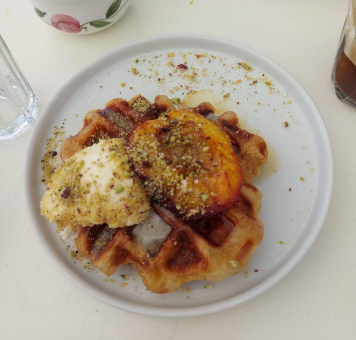 Αφράτη ζύμη για κρουασάν που γίνεται βάφλα, από πάνω μασκαρπόνε και ροδάκινο για να συνδυάζονται γεύσεις και υφές: το κρεμώδες μασκαρπόνε, το γλυκόξινο ροδάκινο και το γλυκάλμυρο croffle συνθέτουν ένα πιάτο που κάνει για τα πάντα. Για πρωινό, για σνακ, για γεύμα, αντί για απογευματινό φρούτο ή παγωτό, για βραδινό μαζί με ελληνικό καφέ και στην τηλεόραση να παίζει κάτι καμμένο.